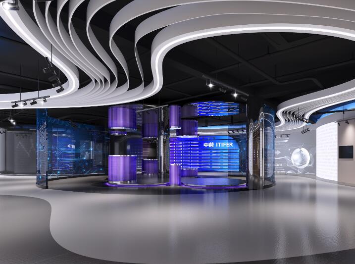 地面:PVC地胶、再生橡胶地板耐磨且易清洁,适合高人流区域;科技展厅使用碳化竹地板,提升质感同时符合环保标准。
